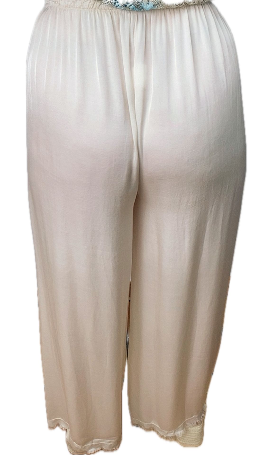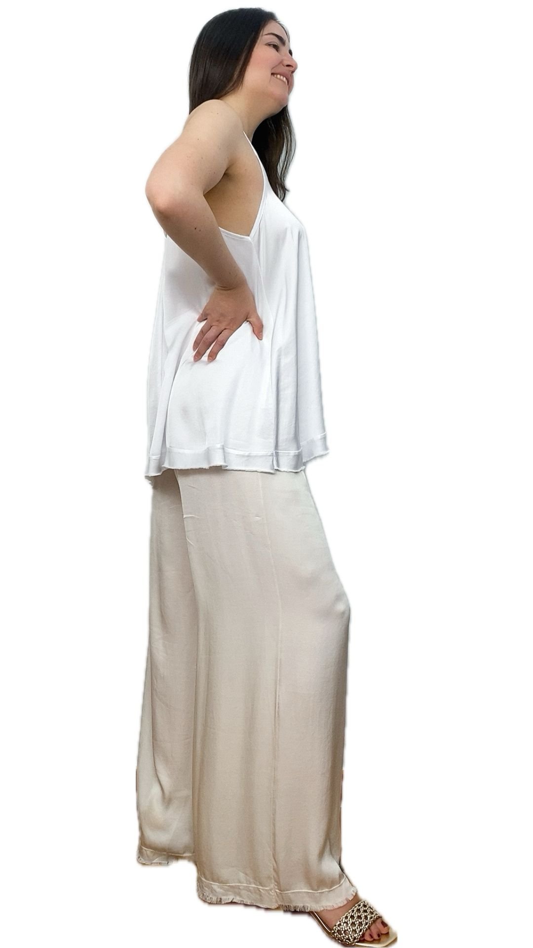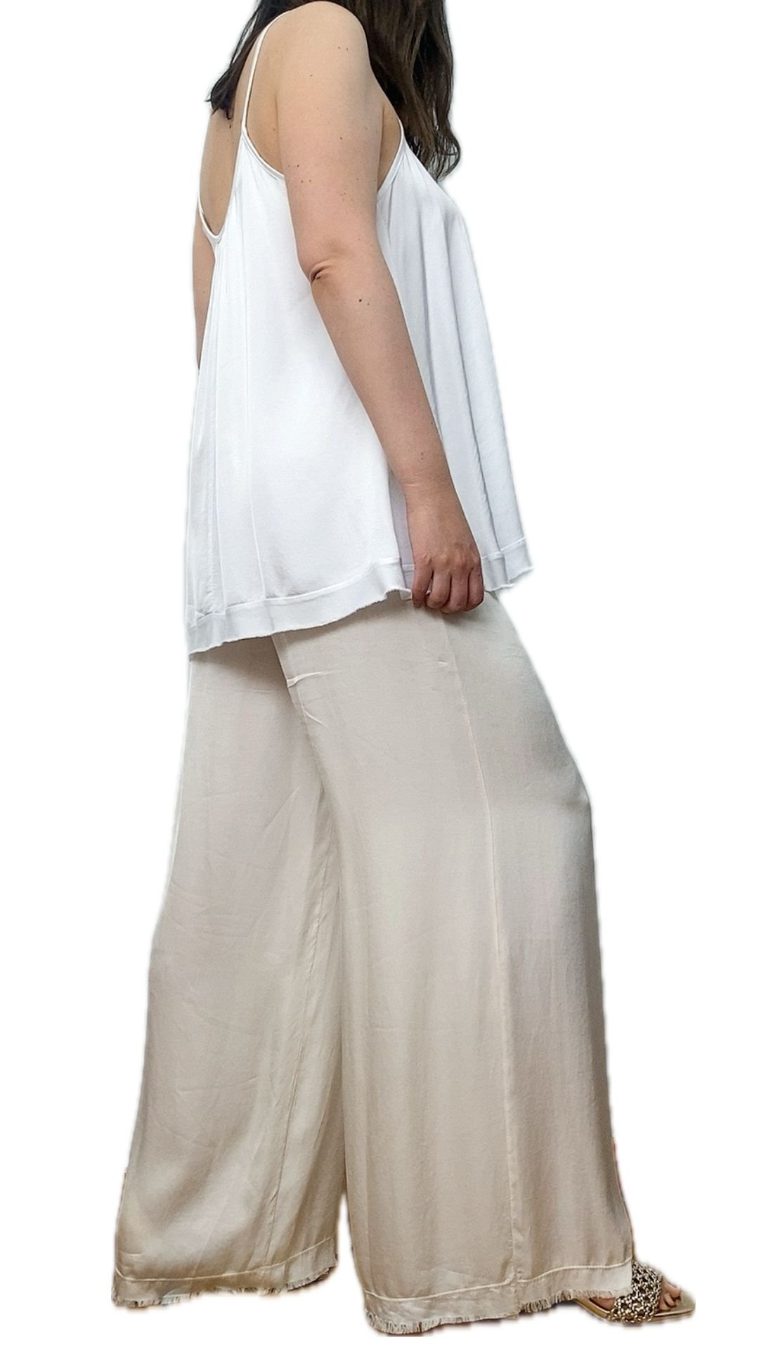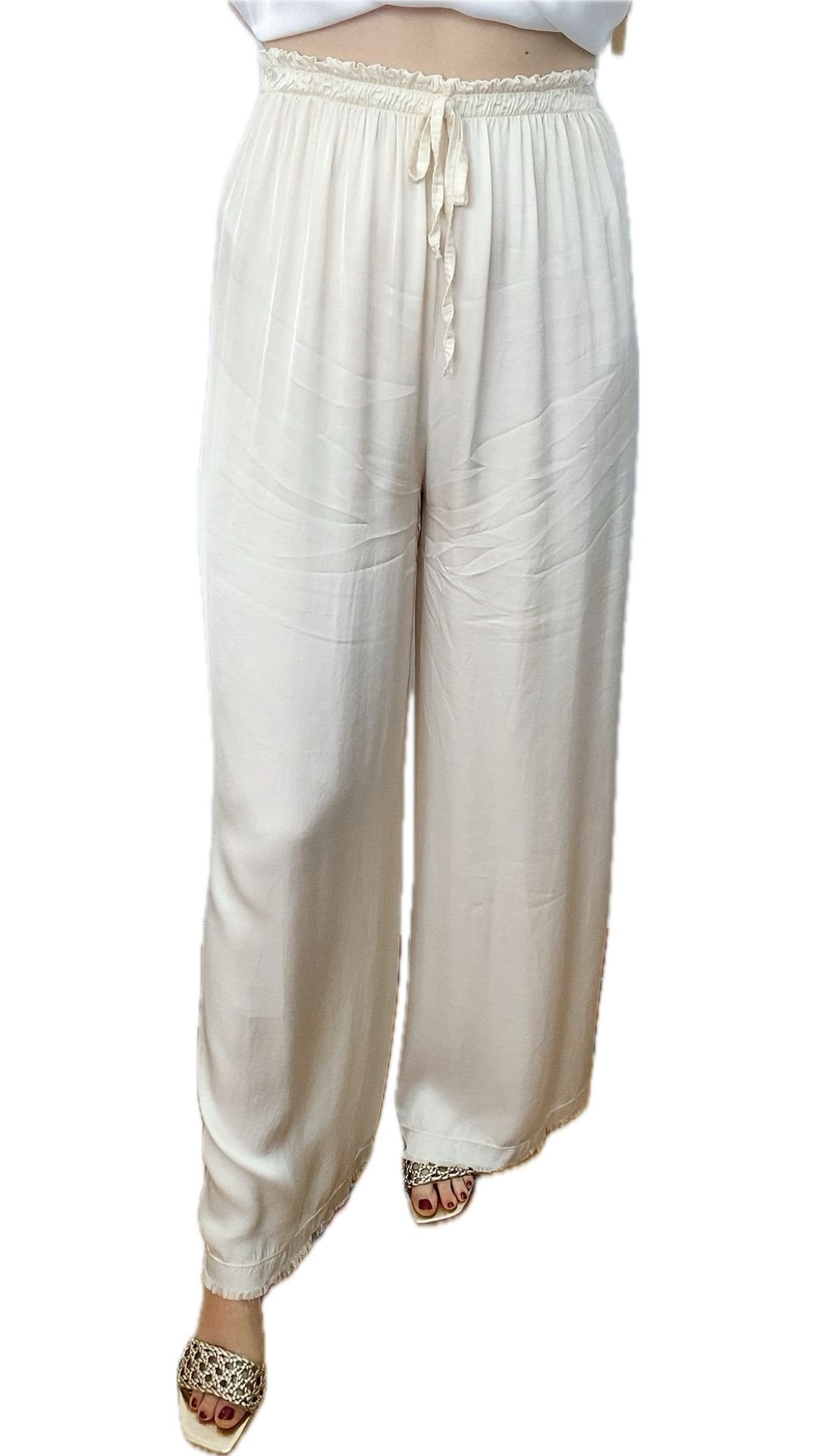 Pantalón Satinado Fluido Ancho Cintura Elástica Tela Viscosa – Pantalón Roma Beige
